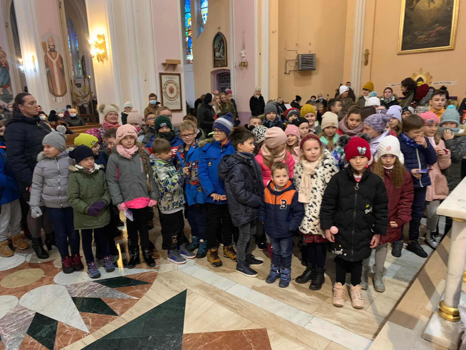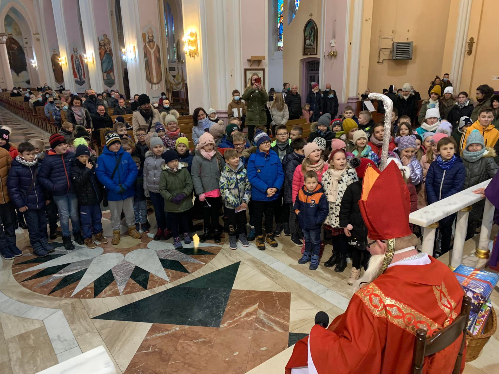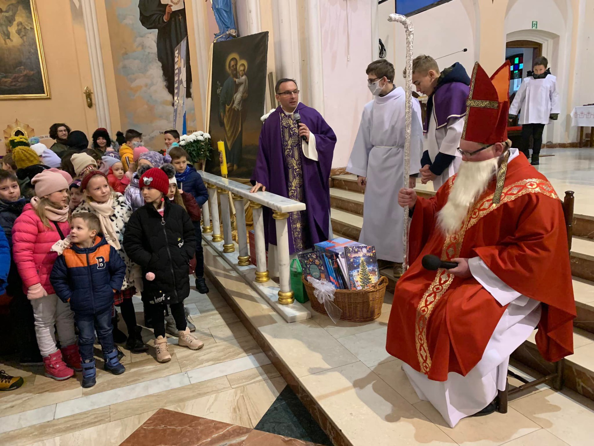 W naszej parafii św. Mikołaj był obecny w niedziele 5 grudnia już od rana. Miał ręce pełne roboty i obawiał się, że nie zdąży na spotkanie z dziećmi. Dzieci, Schola, Liturgiczna Służba Ołtarza i wszyscy wierni zgromadzili się na Mszy św. o godz. 10.30, po której miał odwiedzić ich św. Mikołaj. Po Eucharystii najpierw na zewnątrz rozległ się dźwięk dzwoneczków, a chwilę później w naszej bazylice pojawił się św. Mikołaj. Radość, niedowierzanie i ciekawość malowała się na twarzach. Podczas spotkania, które poprowadził ks. ks. Rafał, wszyscy usłyszeli kim był św. Mikołaj, kogo jest patronem oraz dlaczego na jego pamiątkę obdarowujemy się prezentami.